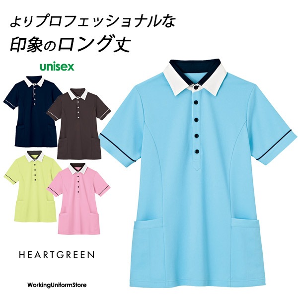 介護ケアウエア 男女共用 半袖ロングポロシャツ HSP004 バーズアイ鹿の子 ハートグリーン