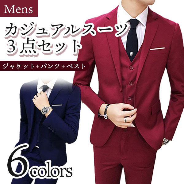 【即納】 スリーピーススーツ カジュアル メンズ ベスト付 3点セット ビジネススーツ フォーマル スーツ 成人式 結婚式 通勤 ...