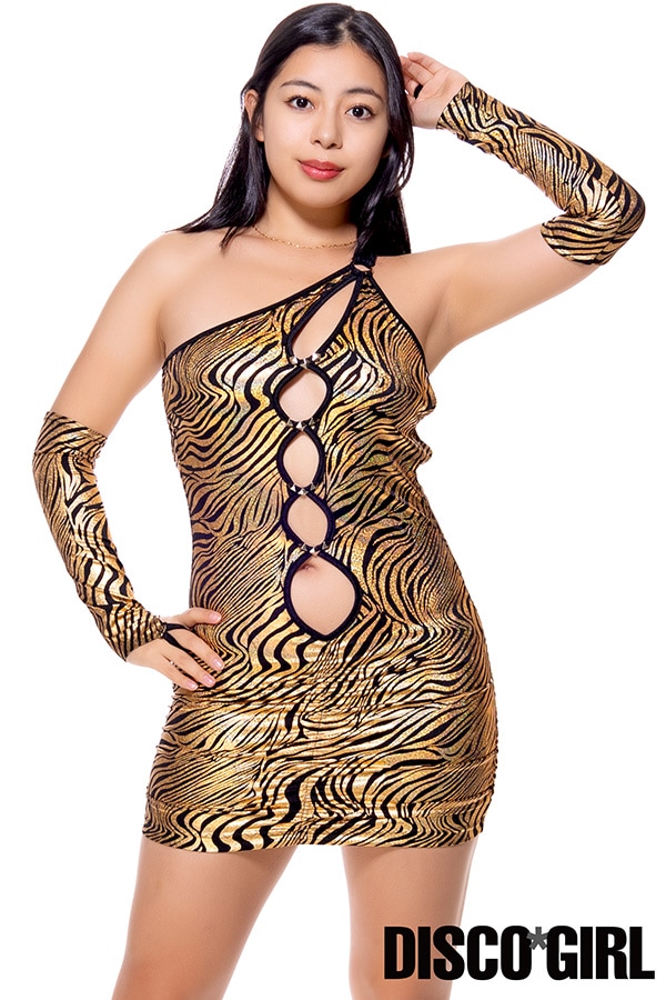 ビット付きフロントサークルカットワンショルダーボディコン・メタリックゴールドゼブラ