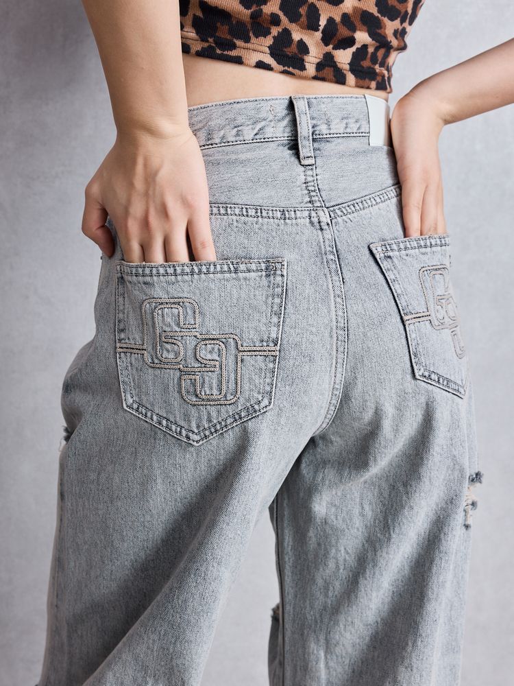 GYDA ハイウエストGG Stitch Barrel Leg ダメージデニムパンツ 0725424193