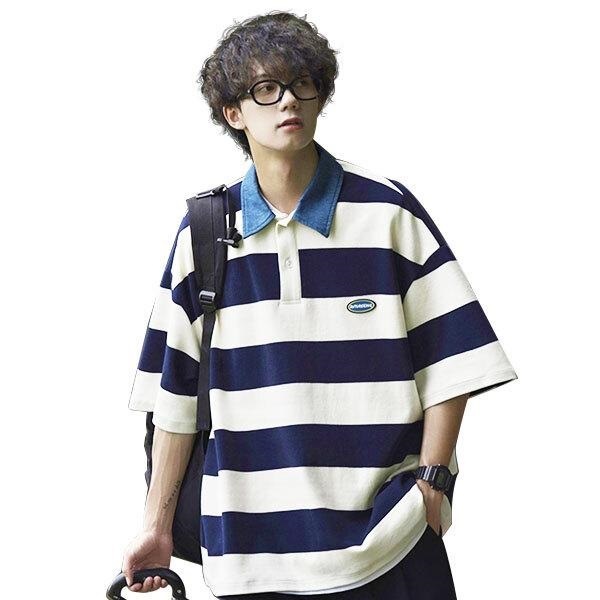 メンズ ポロシャツ ボーダー柄 2カラー 4サイズ オーバーシルエット 爽やか スポーティー レトロカジュアル スポーツ タウンユ...