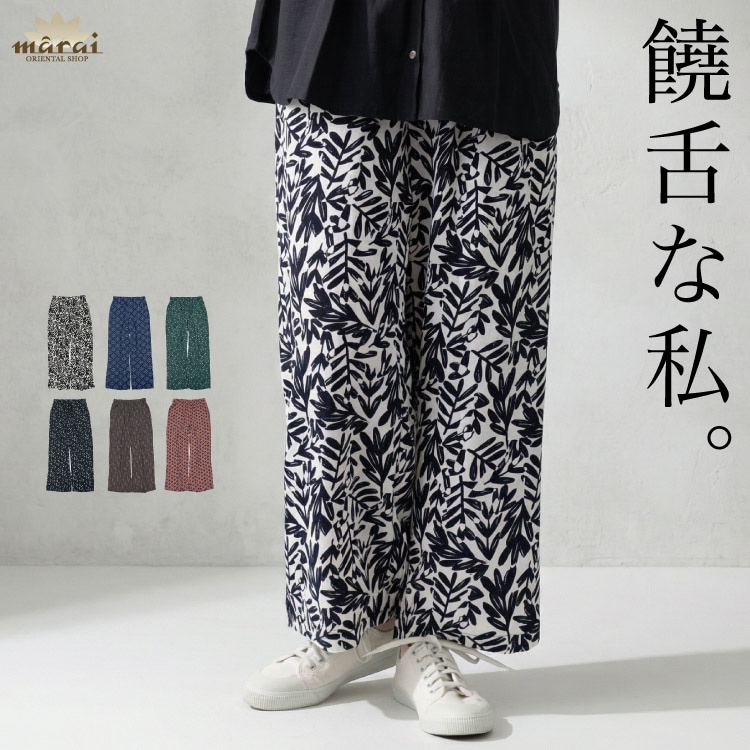 パンツ レディース 春 夏 イージーパンツ ワイドパンツ 饒舌な私。麻タッチプリントパンツ プリント 総柄 ゆったり体型カバー ウ...