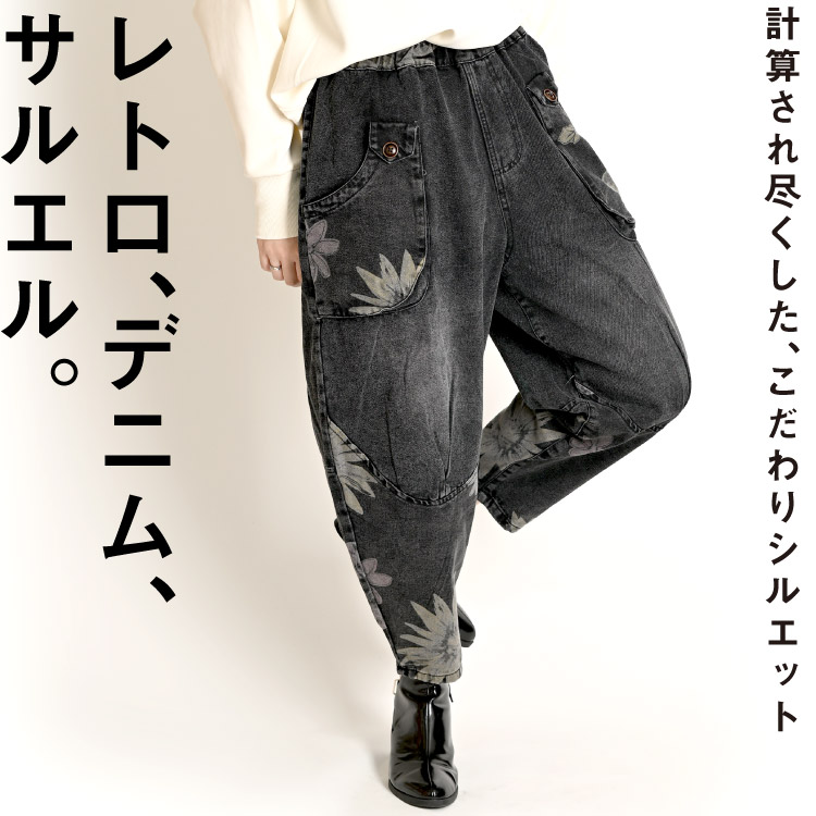 【期間限定10%OFF】オールドレトロな花柄。コットンデニムサルエル