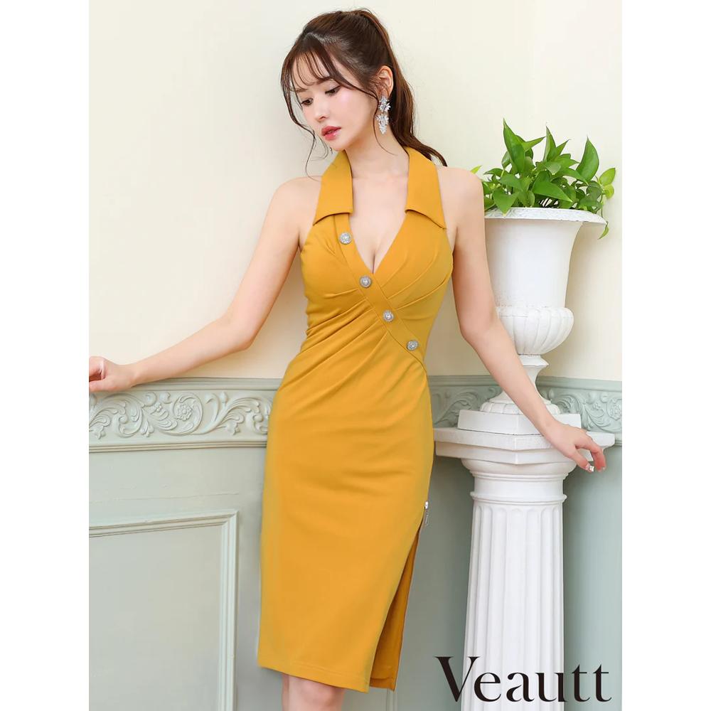 Veautt (ヴュート) 高級ドレープデザイン タイトドレス ビジューホルター バックオープン ミディアム丈 キャバドレス VT...