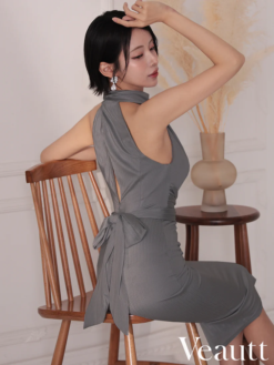 【Veautt/ヴュート】ハイネック バックオープン リボンデザイン ウエストマーク タイト ミディアムドレス ワンピース エレ...