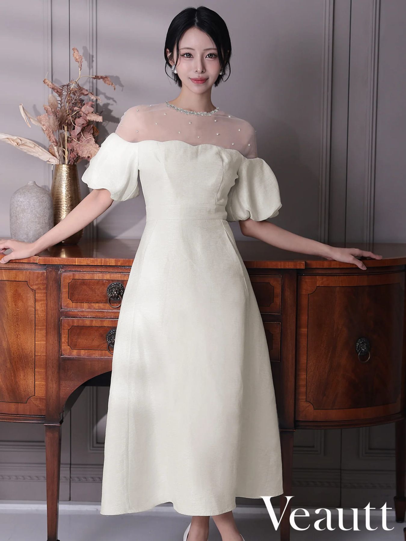 【Veautt/ヴュート】パール×シアー パフスリーブ Aライン ミディアムドレス 上品 可愛い 透け感 袖あり フォーマル 結婚...