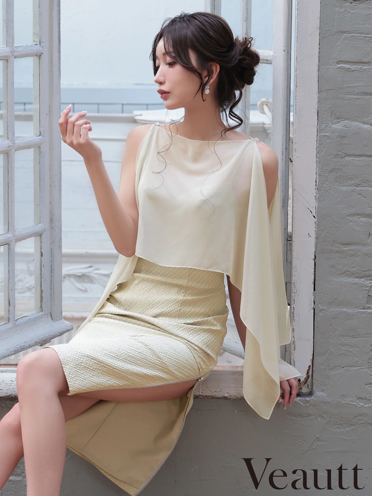予約(2月中旬~2月下旬入荷予定)Veautt ヴュート シフォンケープ 2WAY レイヤード タイト ミディアムドレス オープン...