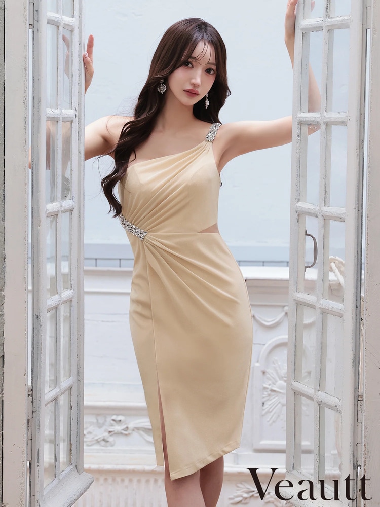 【Veautt/ヴュート】ワンショルダー風 タック&ビジュー付き ジップベア ミディアムタイトドレス ベージュ ホワイト ロイヤル...