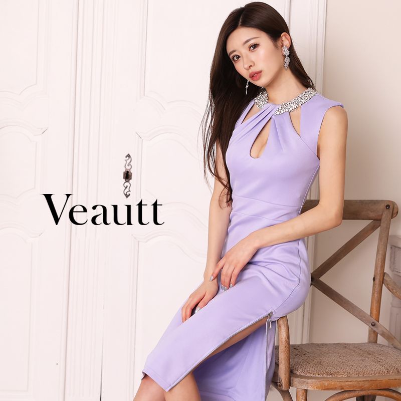 [Veautt/ヴュート] ドレープネック スリットスリーブ パールチャーム タイト ミディアムドレス キャバドレス vt0225...