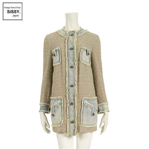 ■ドルチェアンドガッバーナ■ ツイード ノーカラーコート ベージュ 水色 デニム切替 ユーズド加工 38(S) 【DOLCE&GA...