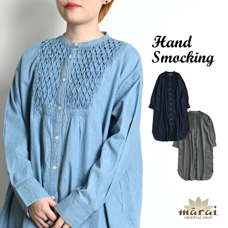 自由でちょうどいいカジュアル。ハンドスモッキングワンピース デニムワンピース ワンピース レディース 長袖 シャツワンピース デニ...