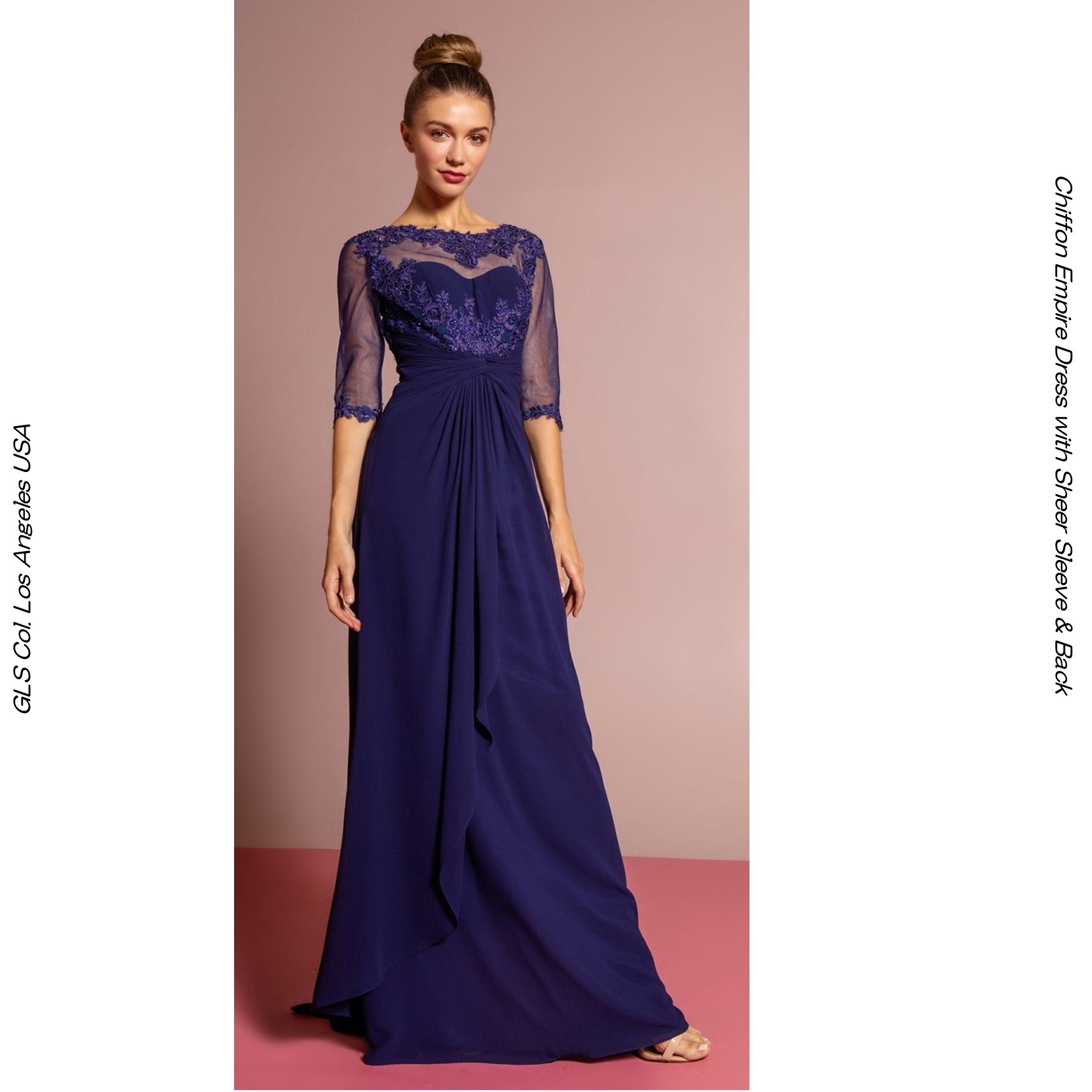 声楽ドレス ピアノ演奏 七分袖ドレス エンパイアドレス ネイビー エンブロイダリーレース 演奏会用ドレス 発表会ドレス マザーズド...