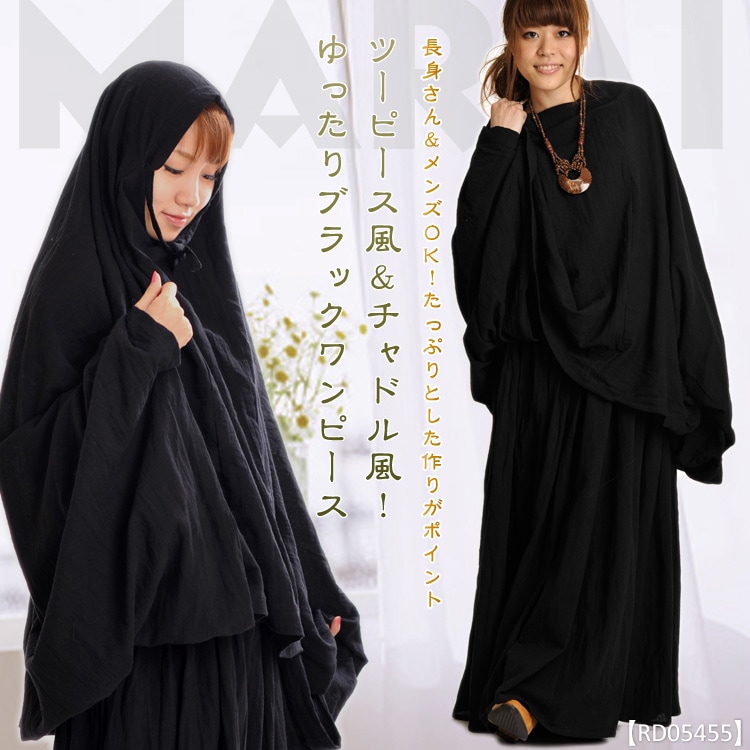 【期間限定10%OFF】ワンピース レディース チャドル ブルカ アバヤ ドレス 黒 ツーピース風&チャドル風!ゆったり ブラック...