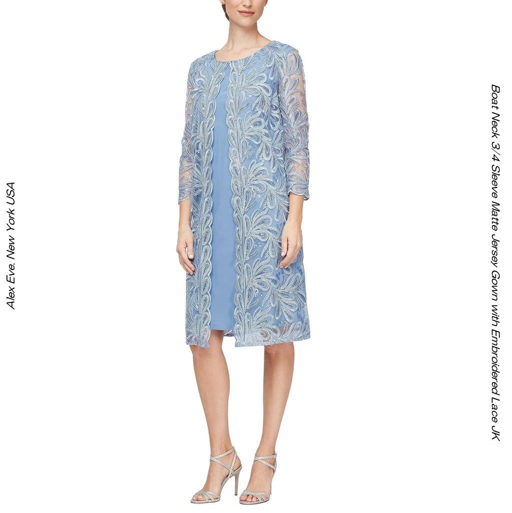 インポートドレス ミディドレス エンブロイダリーレース ボートネック マットジャージー ピアノ演奏 ペリウィンクルブルー ニュ...