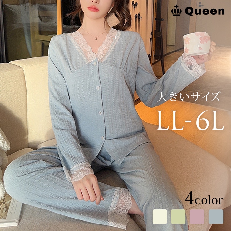 パジャマ 大きいサイズ レディース ルームウェア 長袖 前あき ねまき 上下セット パンツ 無地 春 夏 秋 冬 LL 3L 4L...