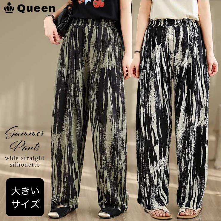 大きいサイズ レディース ワイドパンツ ニュアンス柄 ウエストゴム リラックスパンツ (91526)