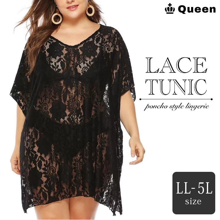大きいサイズ ランジェリー チュニック 黒 総レース 羽織り ネグリジェ セクシー ナイトウェア 部屋着 LL 3L 4L 5L ...