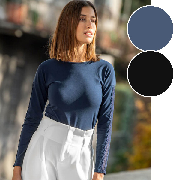 在庫一掃セール 春夏 イタリア インポート カットソー D_ONIS レース切替カットソー ブルー