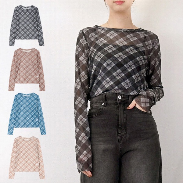 チュールバイアスチェックプリントルーネックプルオーバー