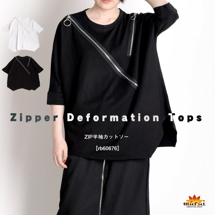 Tシャツ 半袖 五分袖 変形 トップス レディース 印象的なこなれコーデに。ZIP半袖カットソー ジップ ファスナー アシンメトリ...