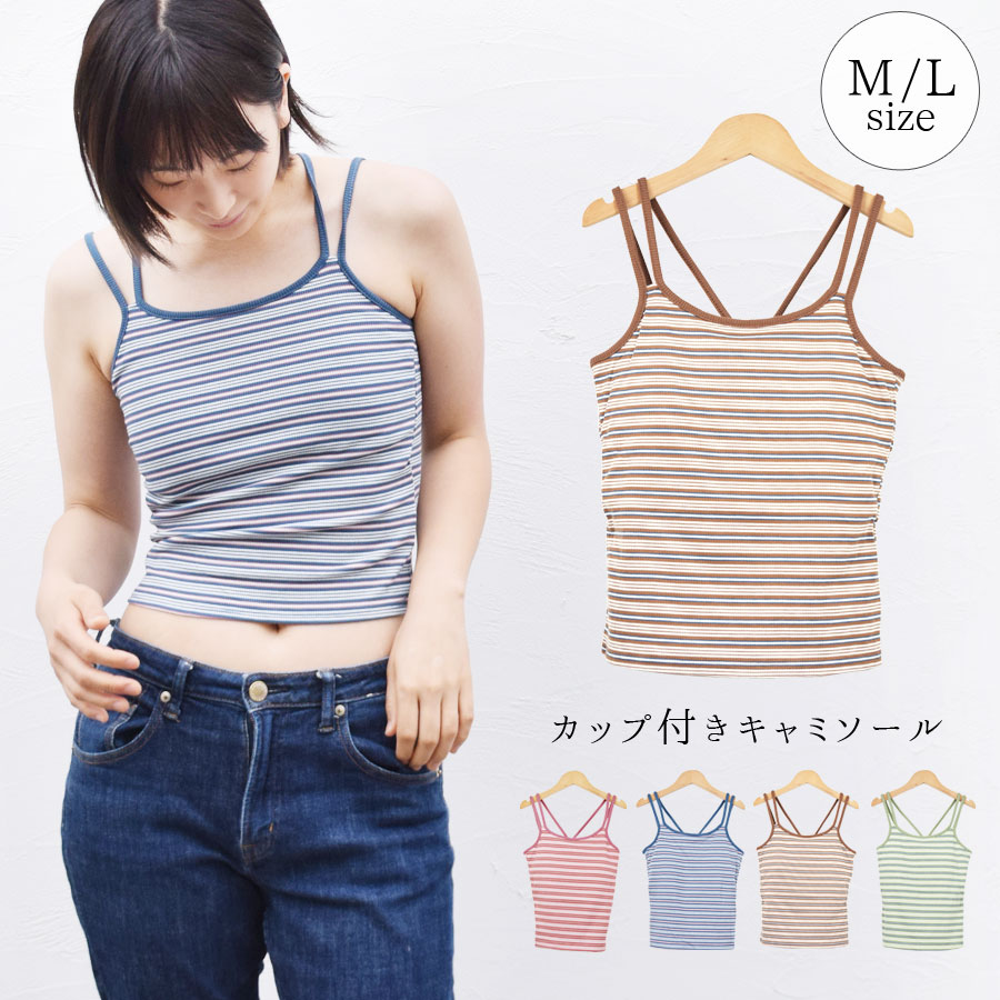 キャミソール カップ付き レディース トップス ダブルストラップ ボーダー リブ ショート丈 【送料pt100】