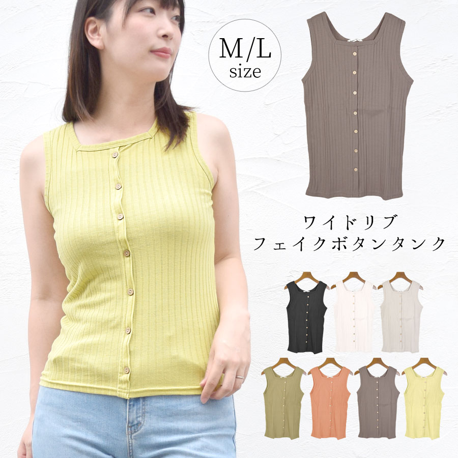 タンクトップ スクエアネック 前ボタン ノースリーブ リブ レディース トップス フェイクボタン 【送料pt100】