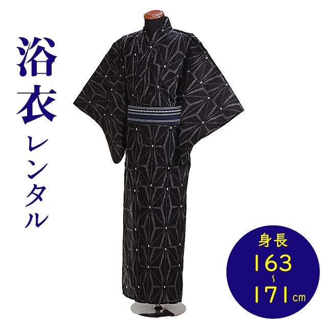 【浴衣 メンズ レンタル】ゆかたレンタル 3点セット☆浴衣・帯・下駄☆nt-my157 黒/麻の葉