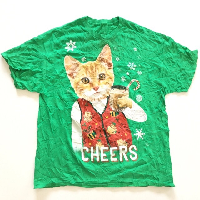 CHEERS 猫Tシャツ アメリカ古着 クリスマス 半袖Tシャツ 送料無料 メンズ L-XL/緑・グリーン 雪柄 乾杯 X\'ma...