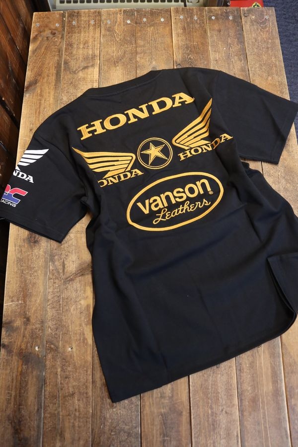 VANSON×HONDAコラボ HRV-2403 HRC ウイング 天竺刺繍Tee Tシャツ ブラックA