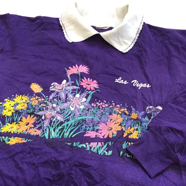 LasVegas ラスベガス フラワープリントスウェット アメリカ古着 レディース 襟付きトレーナー 送料無料 L/紫・パープル・...