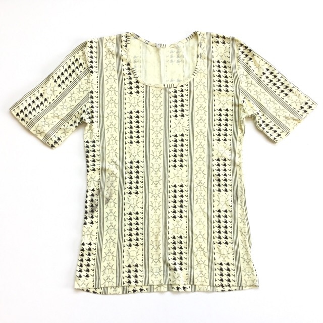 日本製 昭和レトロ かぶと虫 半袖カットソー 半袖Tシャツ レディース S-M/クリームxブラック 千鳥模様 ストライプ カジュア...