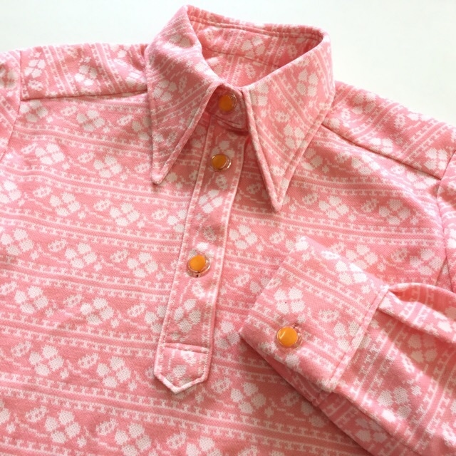 昭和レトロ 国内古着 長袖ブラウス ポリシャツ 送料無料 レディース S-M/ピンク系 花柄 アンティークボタン モダン カジュア...