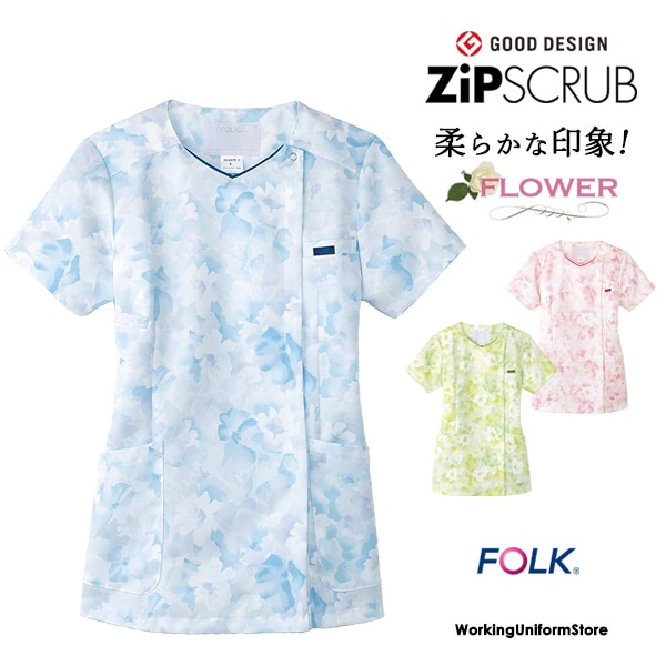 医療白衣 花柄ジップスクラブ 7034SC デコルテプリント フォーク