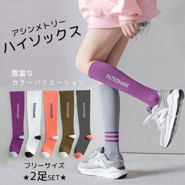 【即納】アシンメトリー ハイソックス 着圧 2足セット レディース ニーハイ スポーツソックス ランニング フィットネス ゴルフ ...