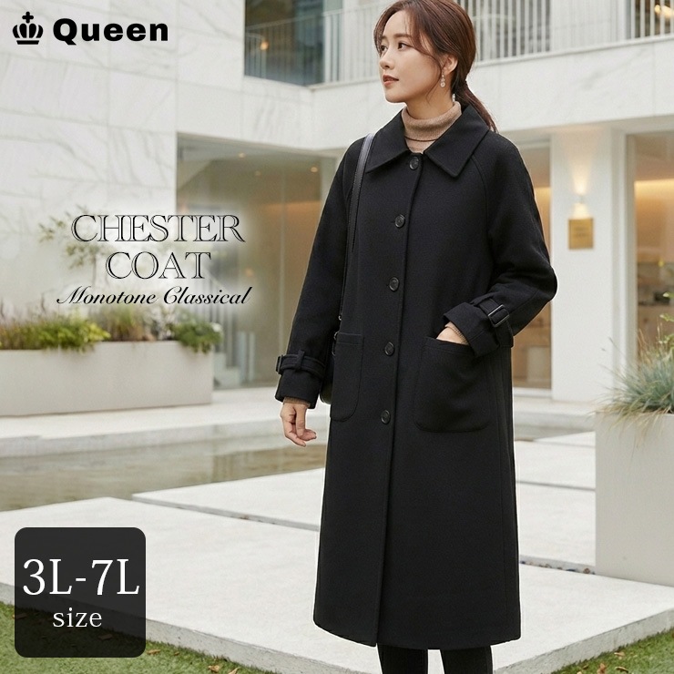 大きいサイズ レディース チェスターコート メルトンコート 黒 ステンカラー ミドル丈 ラグラン袖 3L 4L 5L 6L 7L ...