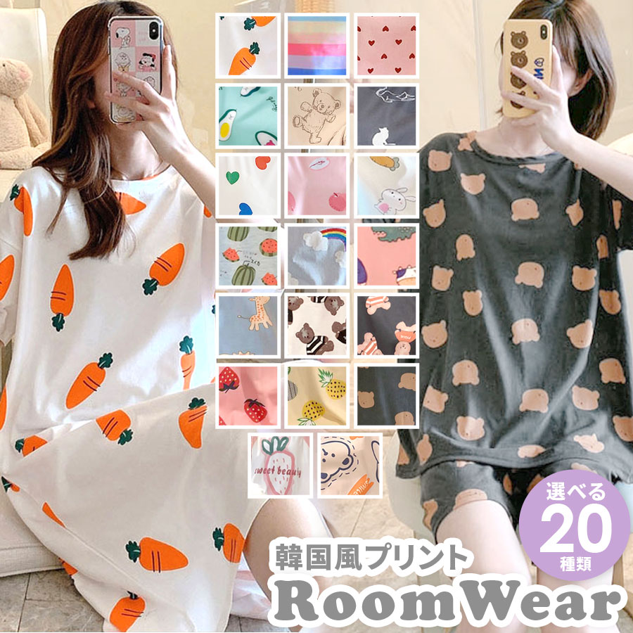 パジャマ ルームウェア 韓国 総柄 プリント セットアップ ワンピース 上下セット 半袖 ショートパンツ 【送料pt100】
