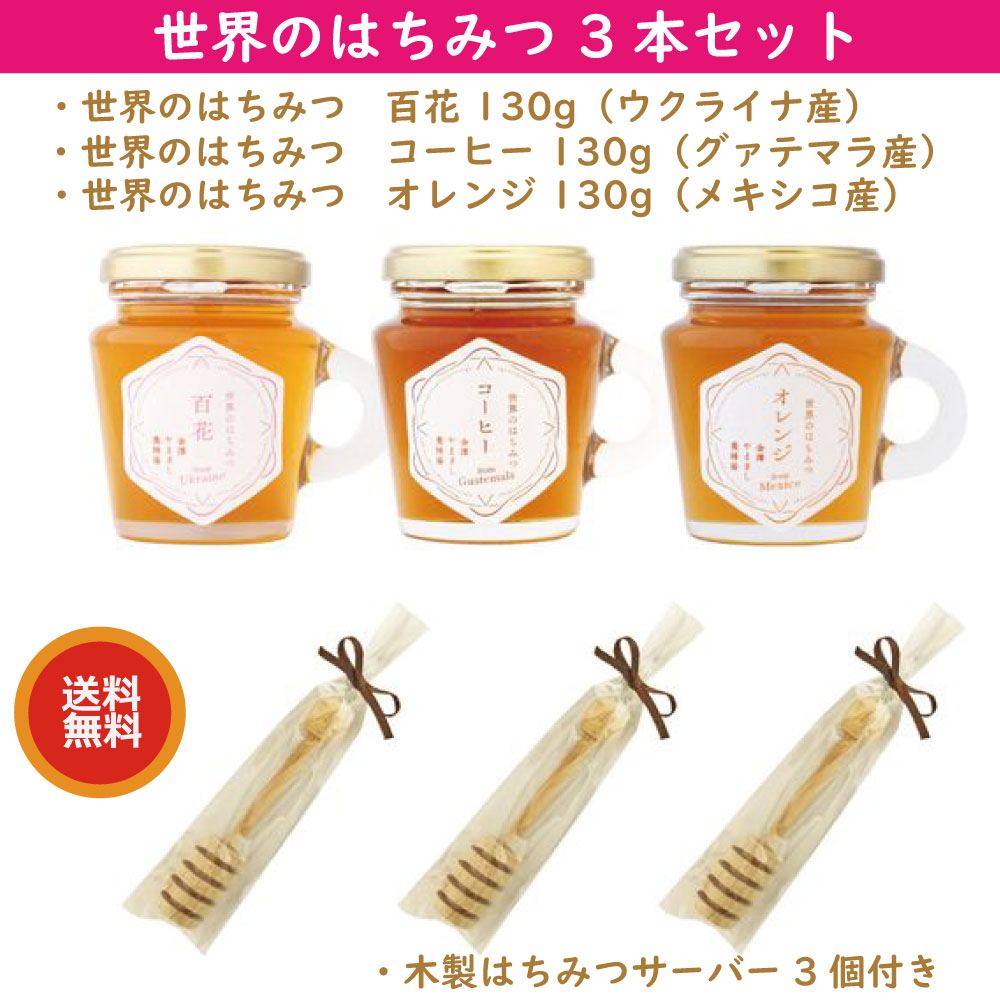 【産直品】世界のはちみつ3本セット(百花・コーヒー・オレンジ)木製はちみつサーバー3個付き