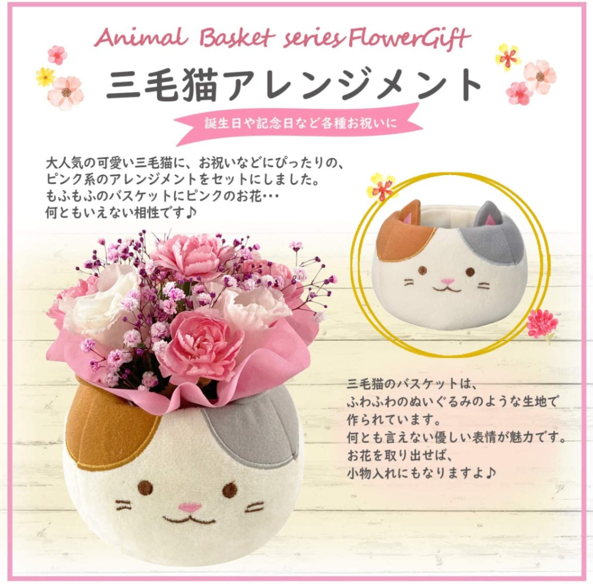 花 アレンジメント 生花 ピンク かわいい 三毛猫