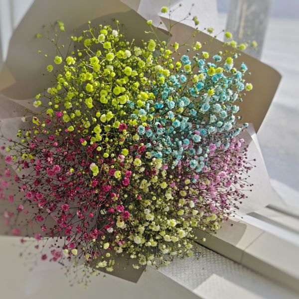 季節のお花をあしらった明るい色目のお祝いアレンジ