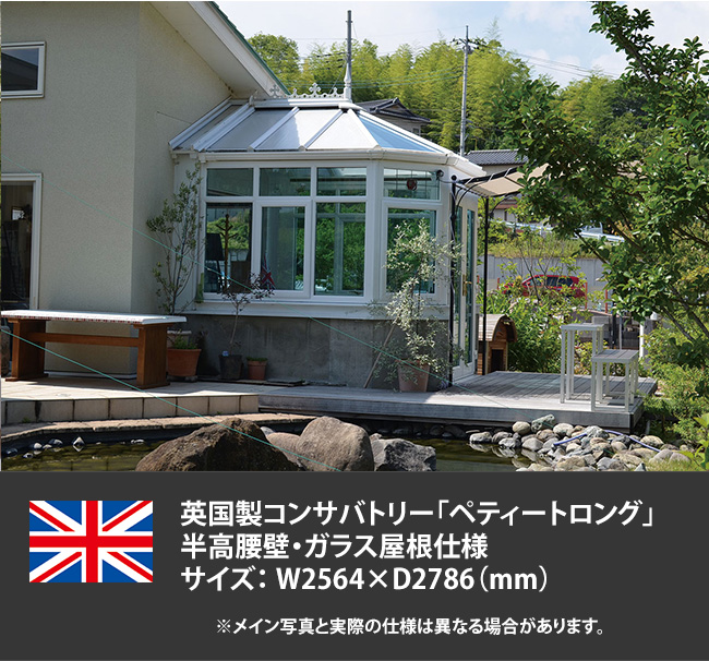 商品名:英国製コンサバトリー「ペティートロング」サイズ:W2564mm×D2786mm 半高腰壁・ガラス屋根仕様※参考価格のため、...