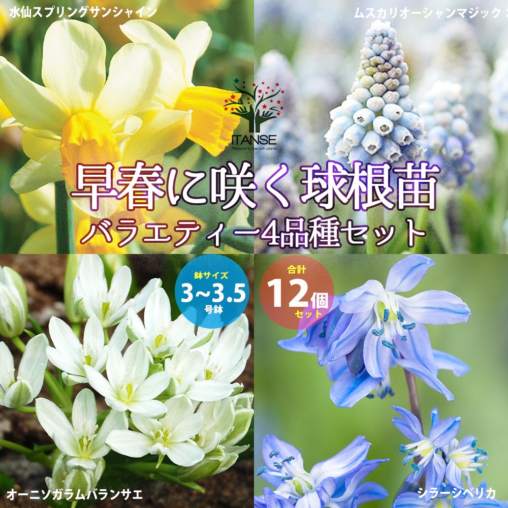 早春に咲く球根苗・バラエティー4品種Aセット(合計12個) ムスカリ・オーシャンマジック/水仙・スプリングサンシャイン/オーニソガ...