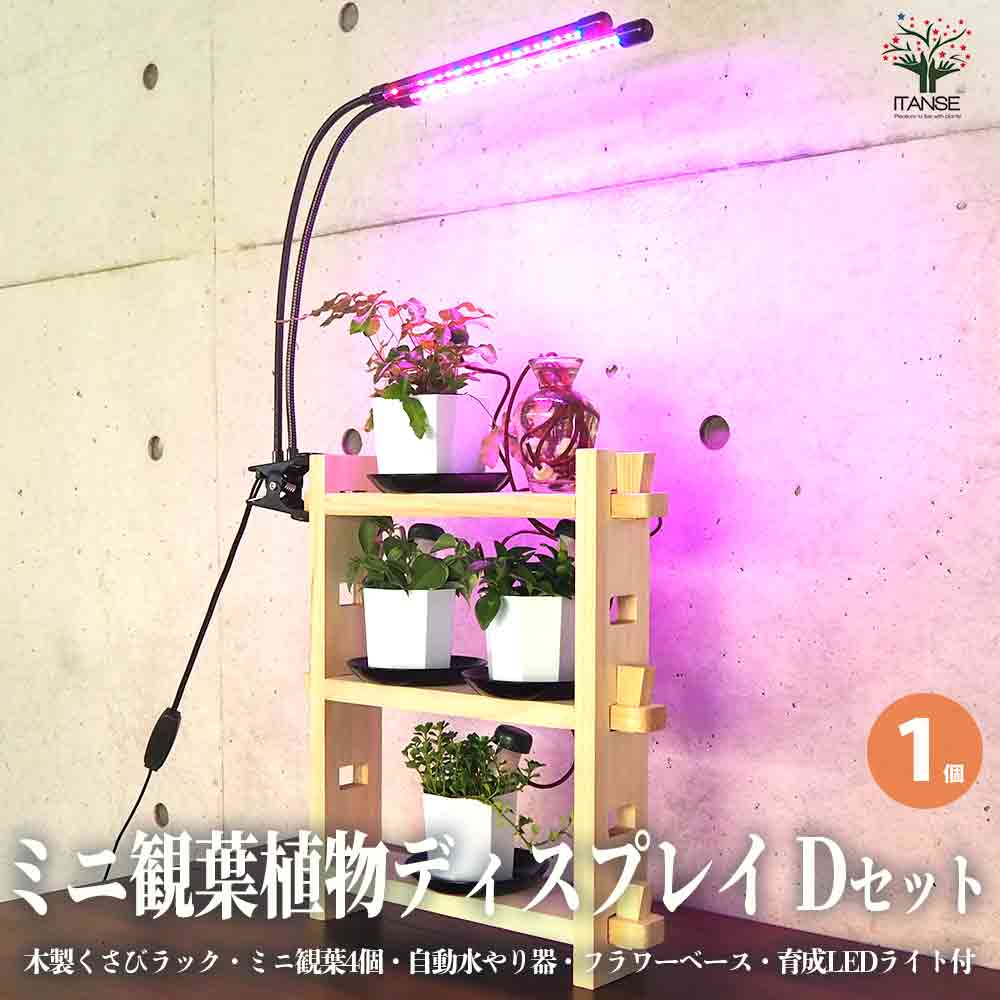 ミニ観葉植物ディスプレイ&生育棚 自動水やり器付き・木製くさびラックDセット(ミニ観葉4個付き・育成ライト付き)【資材 /1個売り...