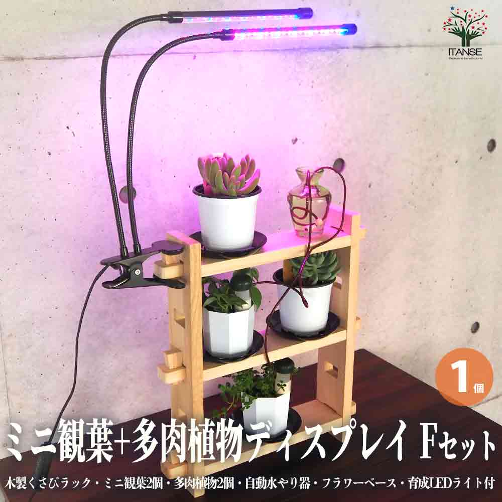 ミニ観葉+多肉植物ディスプレイ&生育棚 自動水やり器付き・木製くさびラックFセット(ミニ観葉2個、多肉植物2個付き・育成ライト付き...