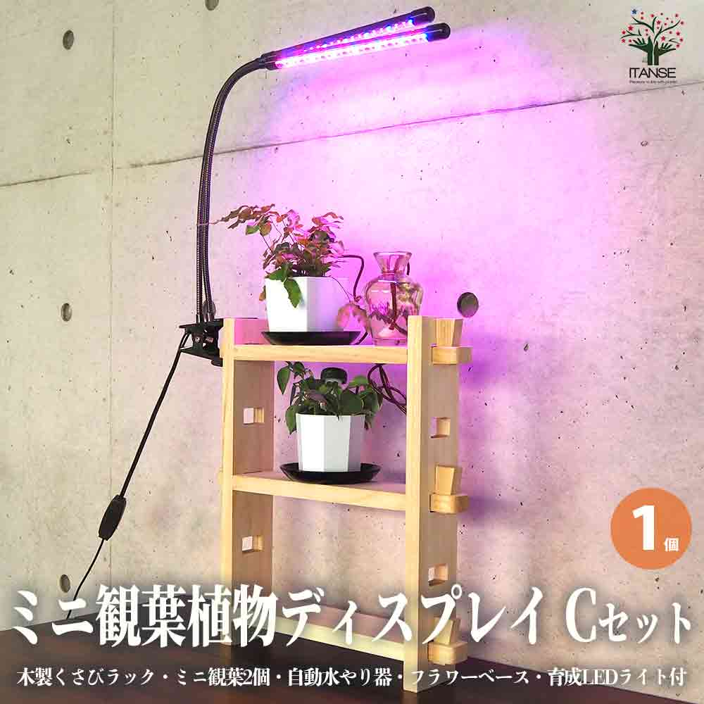 ミニ観葉植物ディスプレイ&生育棚 自動水やり器付き・木製くさびラックCセット(ミニ観葉2個付き・育成ライト付き)【資材 /1個売り...