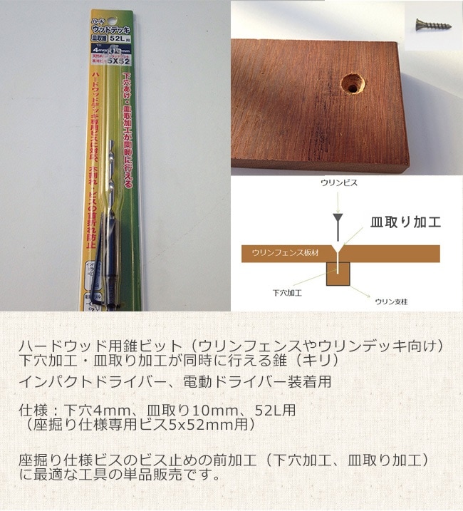 【ハードウッド用皿取錐ビット】仕様:下穴4mm、皿取り10mm、52L用(座掘り仕様専用ビス5x52mm用)下穴加工・皿取り加工が...