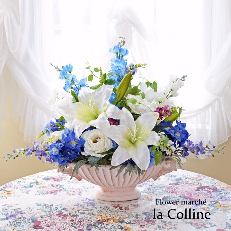 カサブランカとデルフィニュームのブルーホワイトアレンジ【アーティフィシャルフラワー(高級造花)アレンジ】