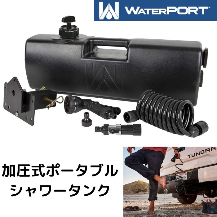WaterPORT 自加圧式シャワー付きポータブル水タンク 15L 車載 ポータブルシャワー キャンプ トラック 荷台 ヒッチ バ...