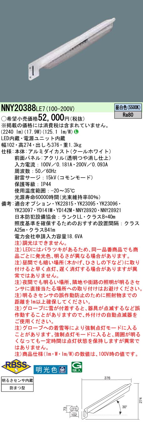 (在庫有り)LED防犯灯 NNY20388LE7 パナソニック 20VA 明るさセンサあり (NNY20467LE1相当品)