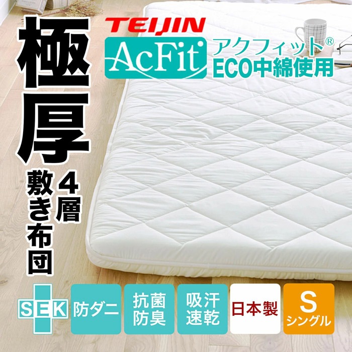 敷布団 シングル 日本製 四層ボリューム敷布団 アクフィット シングルサイズ 防ダニ 抗菌 防臭 吸汗 速乾加工中綿
