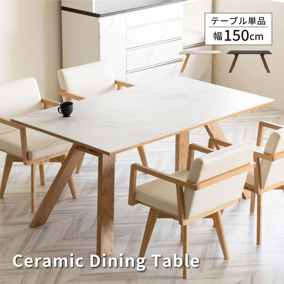 [幅150] セラミック ダイニングテーブル 白 黒 テーブル 150cm 石目柄 ホワイト ブラック 木脚 X脚 4人掛け 食卓...